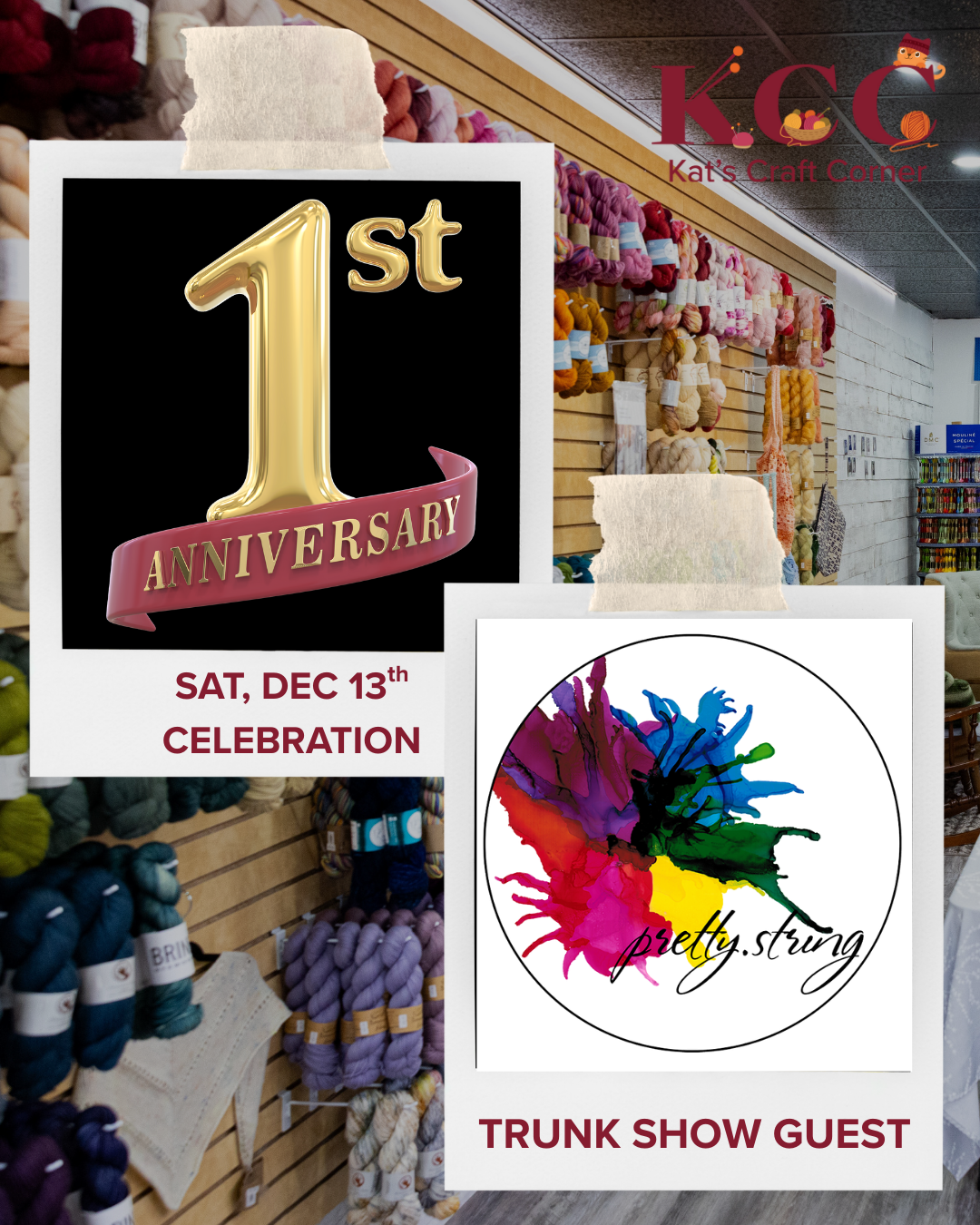 We are turning one! Celebrate a year of us being open to the public on Saturday, Dec 13th from 10 am to 6 pm. Featuring a special guest, Pretty String Yarn.