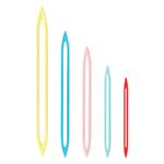5 lengths that feature an eye that runs the entire length makes them much easier to thread and use than traditional needles. 5 sizes means there is a size for all yarn weights. Assorted colours.