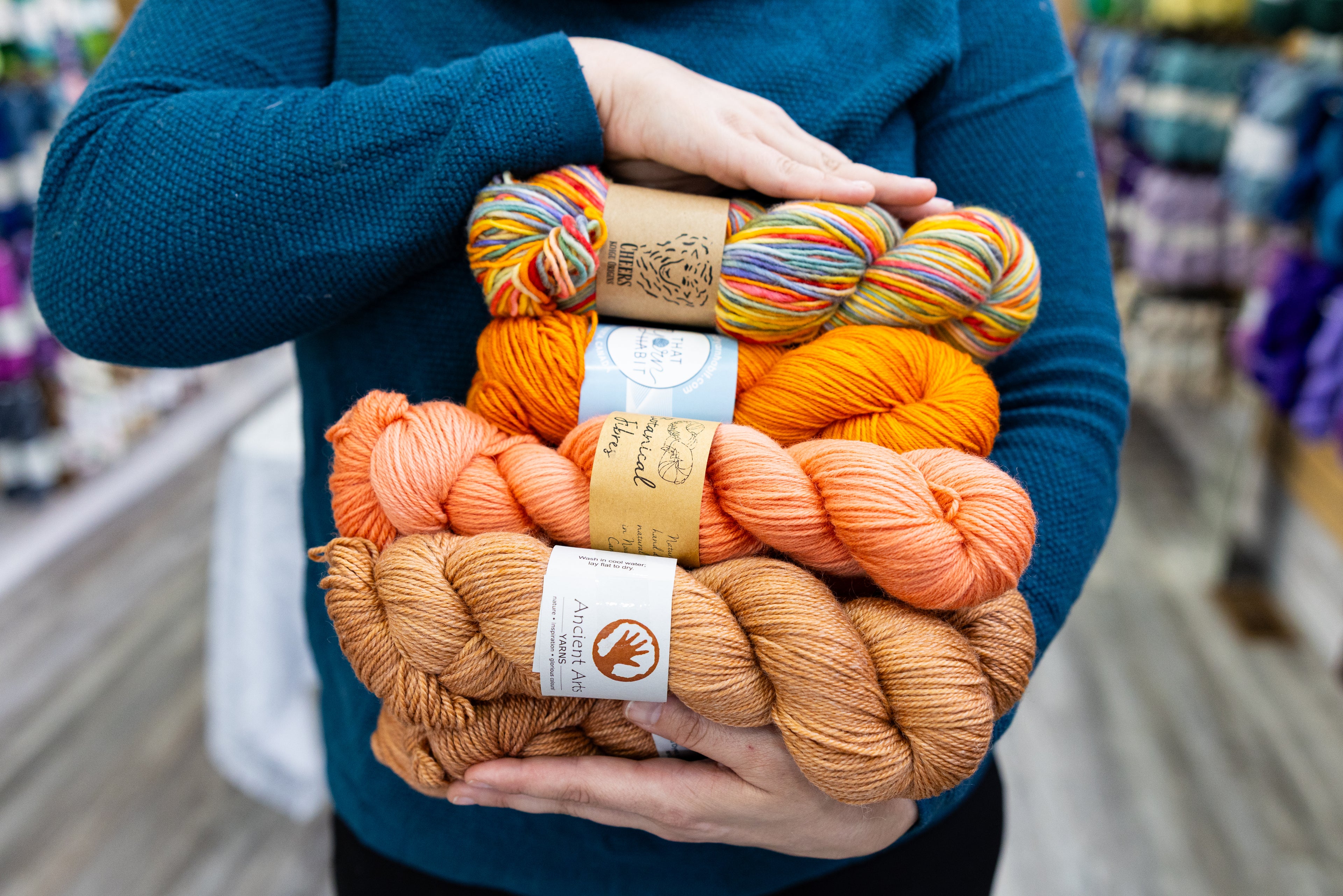 Our objective is to offer more than 50% of our stock having been either sourced, produced, and/or dyed in Canada. We are proud to say that we offer a plethora of Canadian yarn brands to sink your needles and hooks into. Brands include Ancient Arts Yarns, Koigu, Natural Ewe and more.
